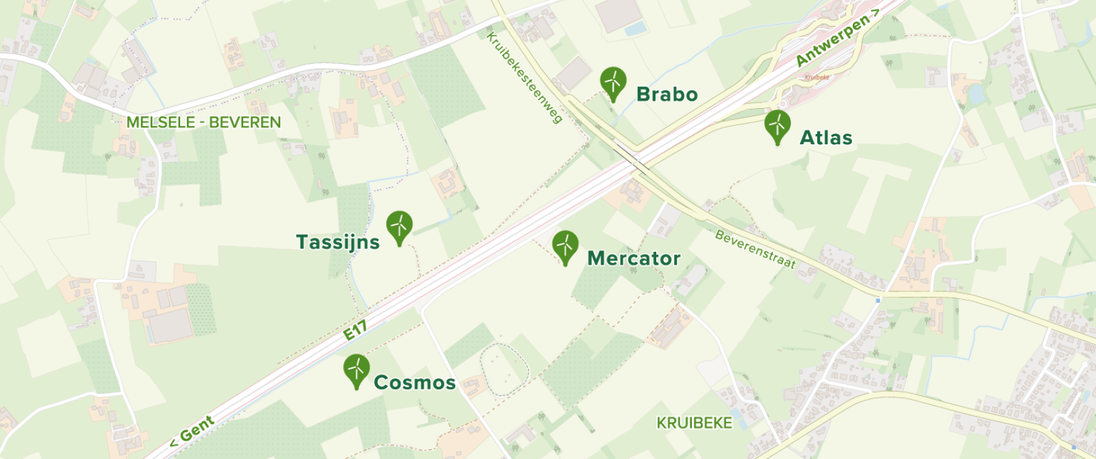 De drie windturbines hebben elk een eigen naam. Van oost naar west heten ze Atlas, Mercator en Cosmos. Deze namen verwijzen naar de beroemde inwoner van Kruibeke, Mercator, en zijn twee bekendste boeken.